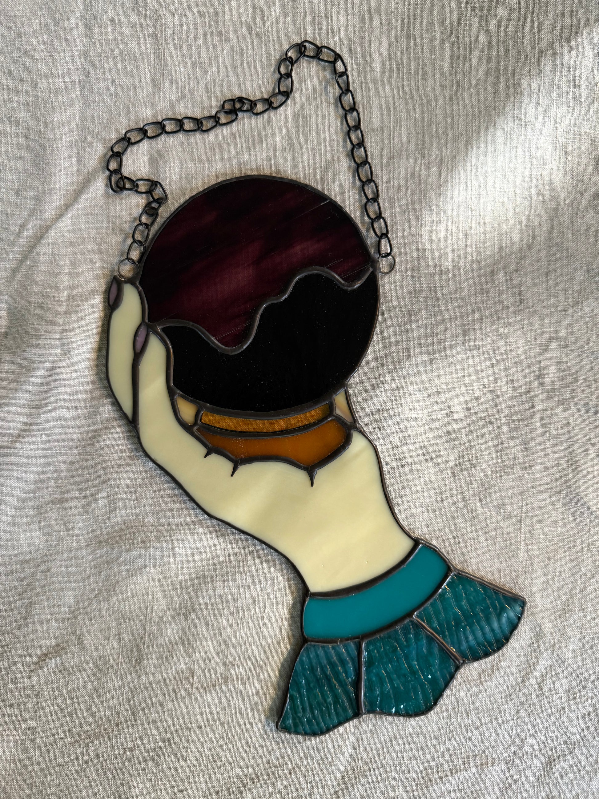 This art nouveau inspired hand holds a two-tone crystal ball of deep purple with a slightly lighter streaky purple-a beautiful vintage Bullseye. The cuff and ruffle are an interesting mix of teals and greens with a whole lot of texture on the ruffle. This piece measures approximately 5 1/2 by 10 inches and includes a black chain for hanging.