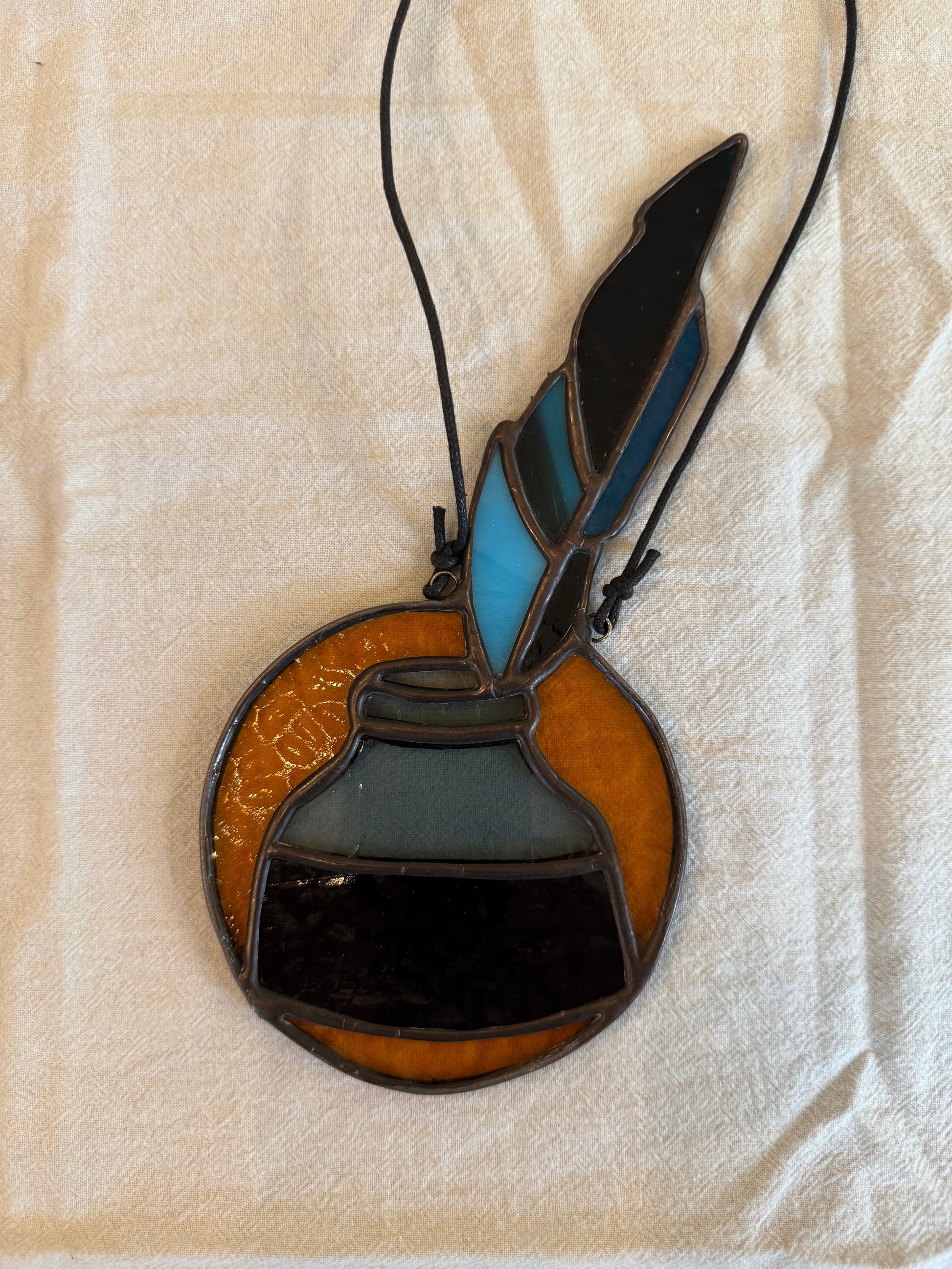 This adorable glass inkwell and quill is done in a mix of vintage blue glass for the feather with a beautiful inky blue vintage mouth-blown piece and patent black Moretti for the inkwell all against a textured marigold background. Makes for a perfect gift! Measures approximately 4 inches around and 7 inches high and comes with a coated black cord for hanging.