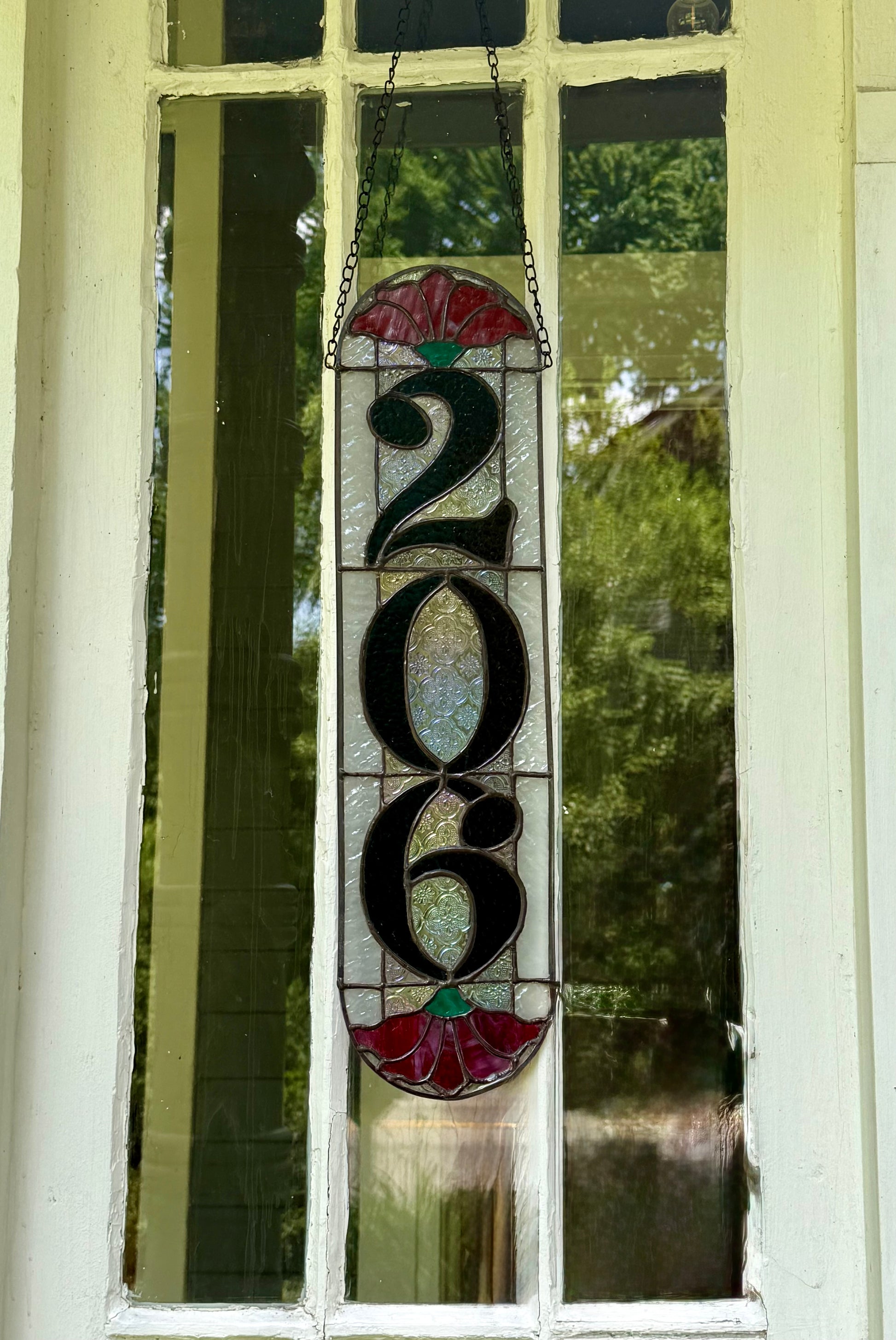 Enjoy a beautiful, one-of-a-kind welcome home every day. The possibilities in terms of color scheme are endless, but I like using a vintage white ripple border with dark transparent numbers done on a clear Morisco background-it's lacy details are subtle but add so much interest. The floral detail on the end could be any color. In fact, it could be something different entirely- a daisy, a mushroom, a bird. Reach out if you'd like something more custom. I'd love to make something especially unique!